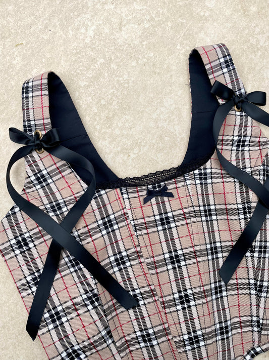 Reworked beige tartan corset top - SIZE 8 UK (S)