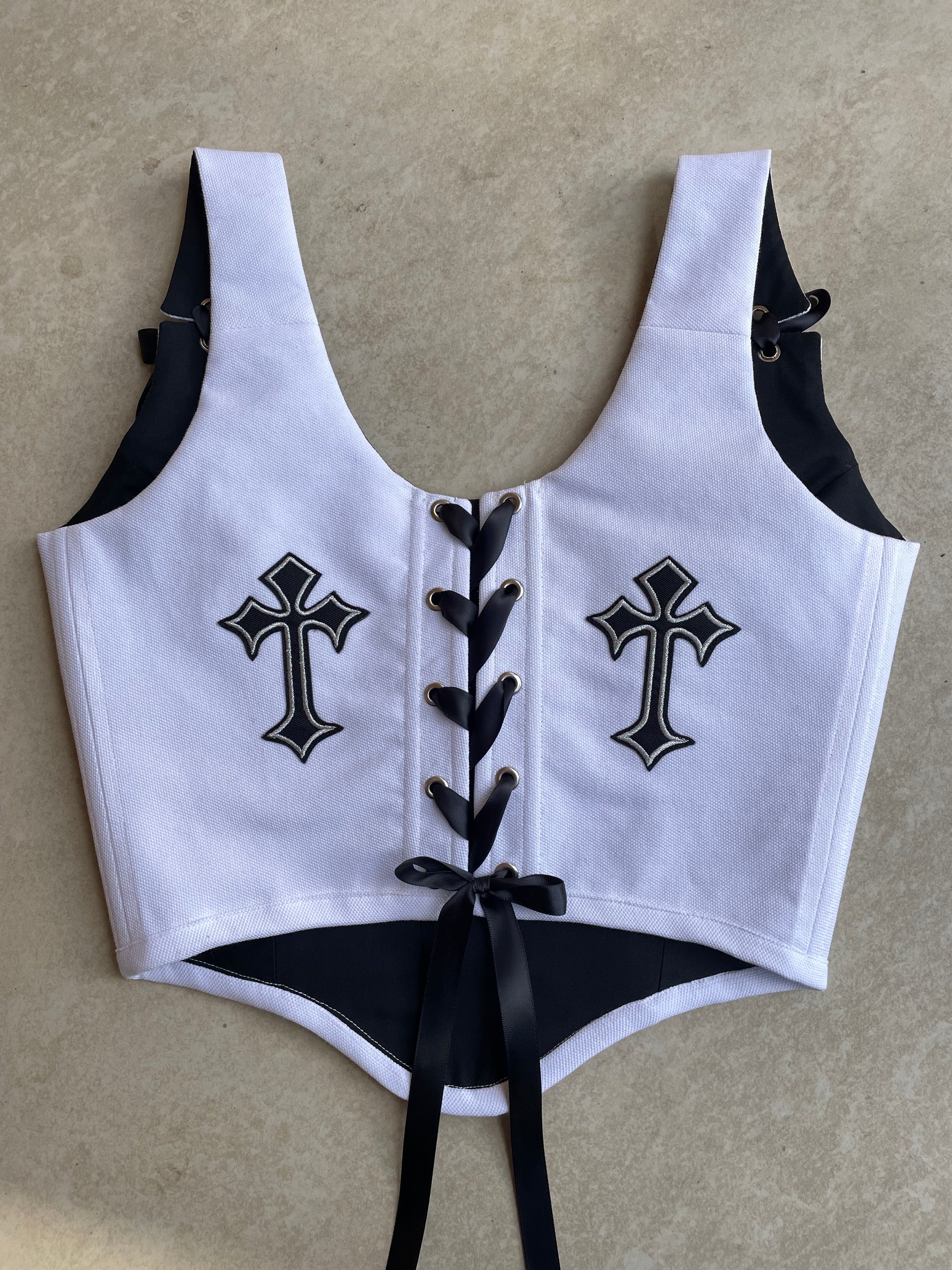 Corset reworked from a thrifted mens black polo-shirts - featuring satin ribbon shoulder and back ties.
